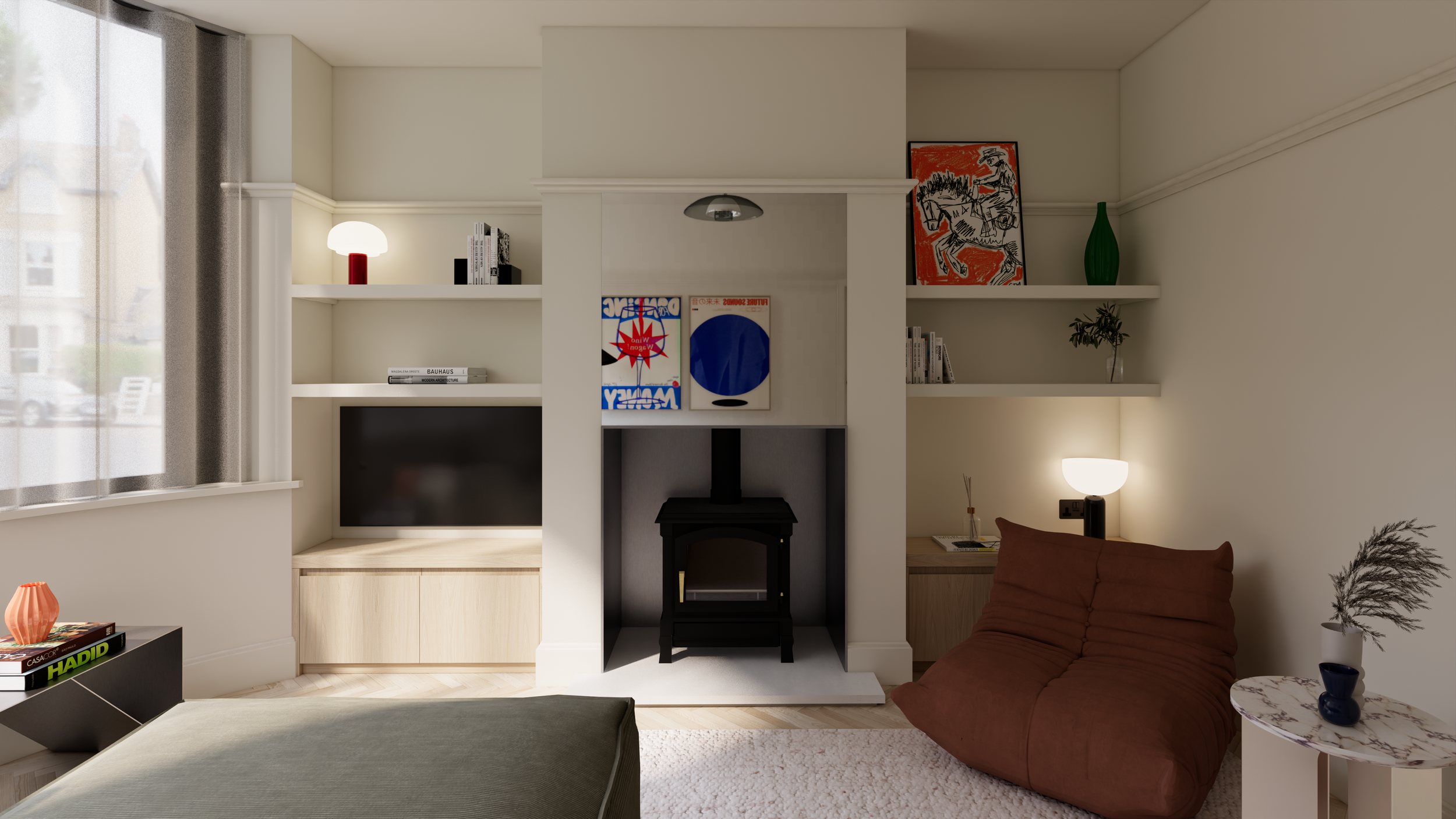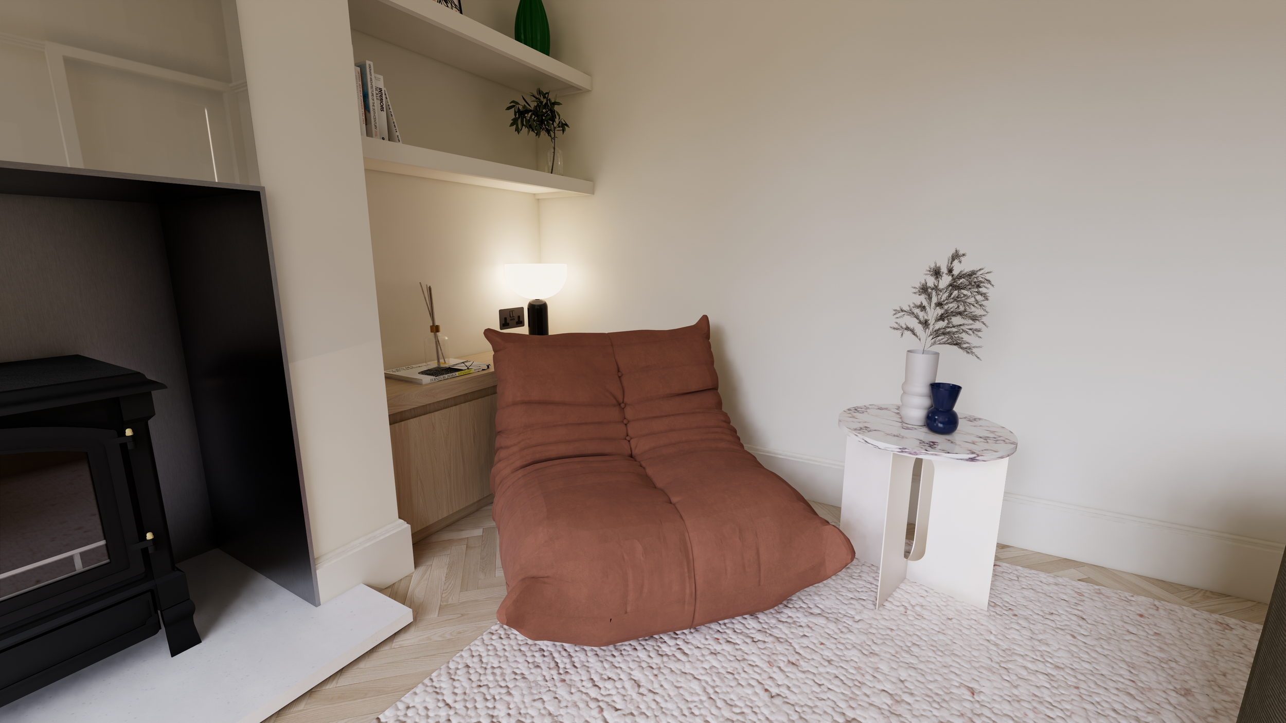 KINFAUNS LANE LOUNGE Green corduroy, Light wood veneer & brushed stainless steel create a refined yet creative palette for a living space.